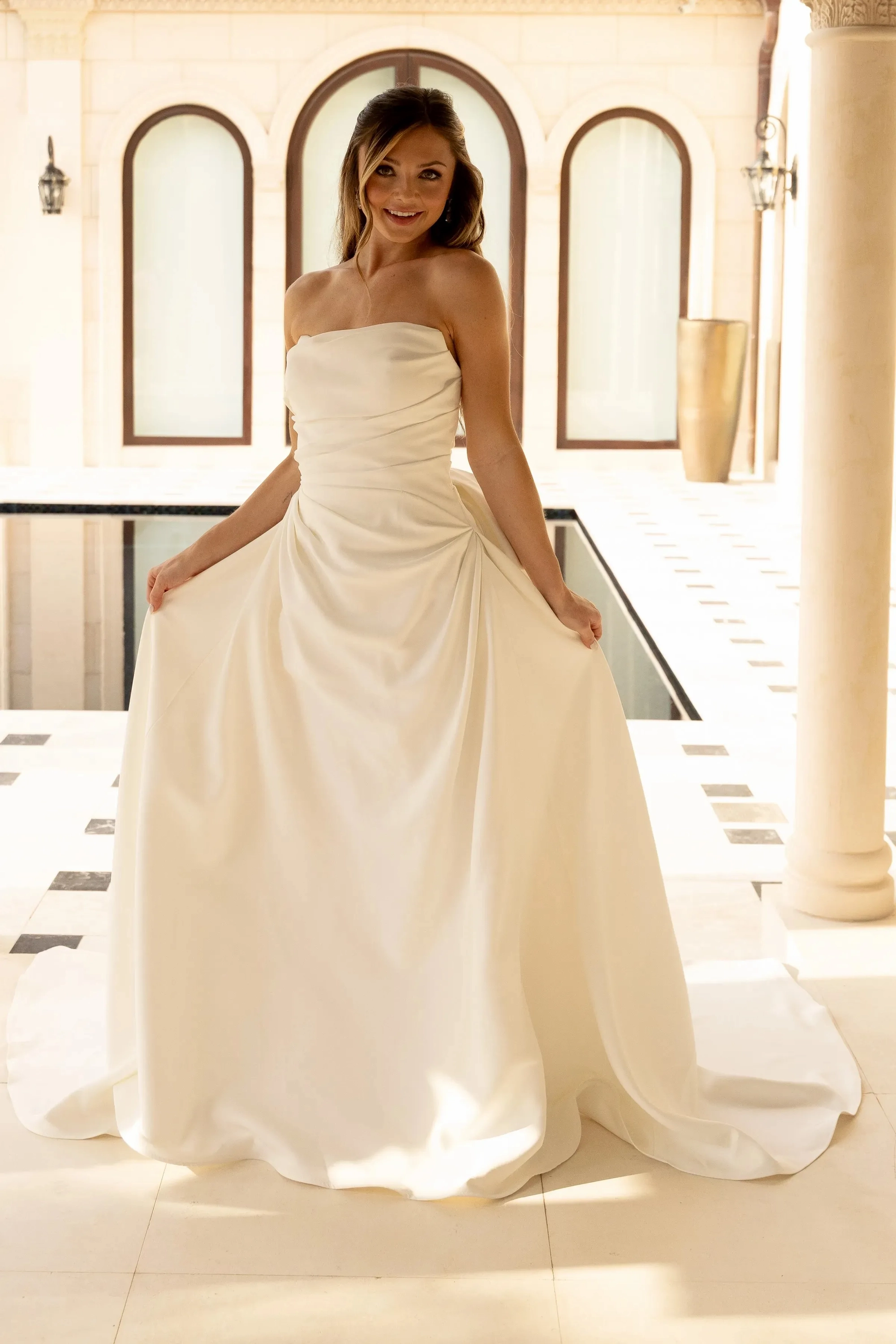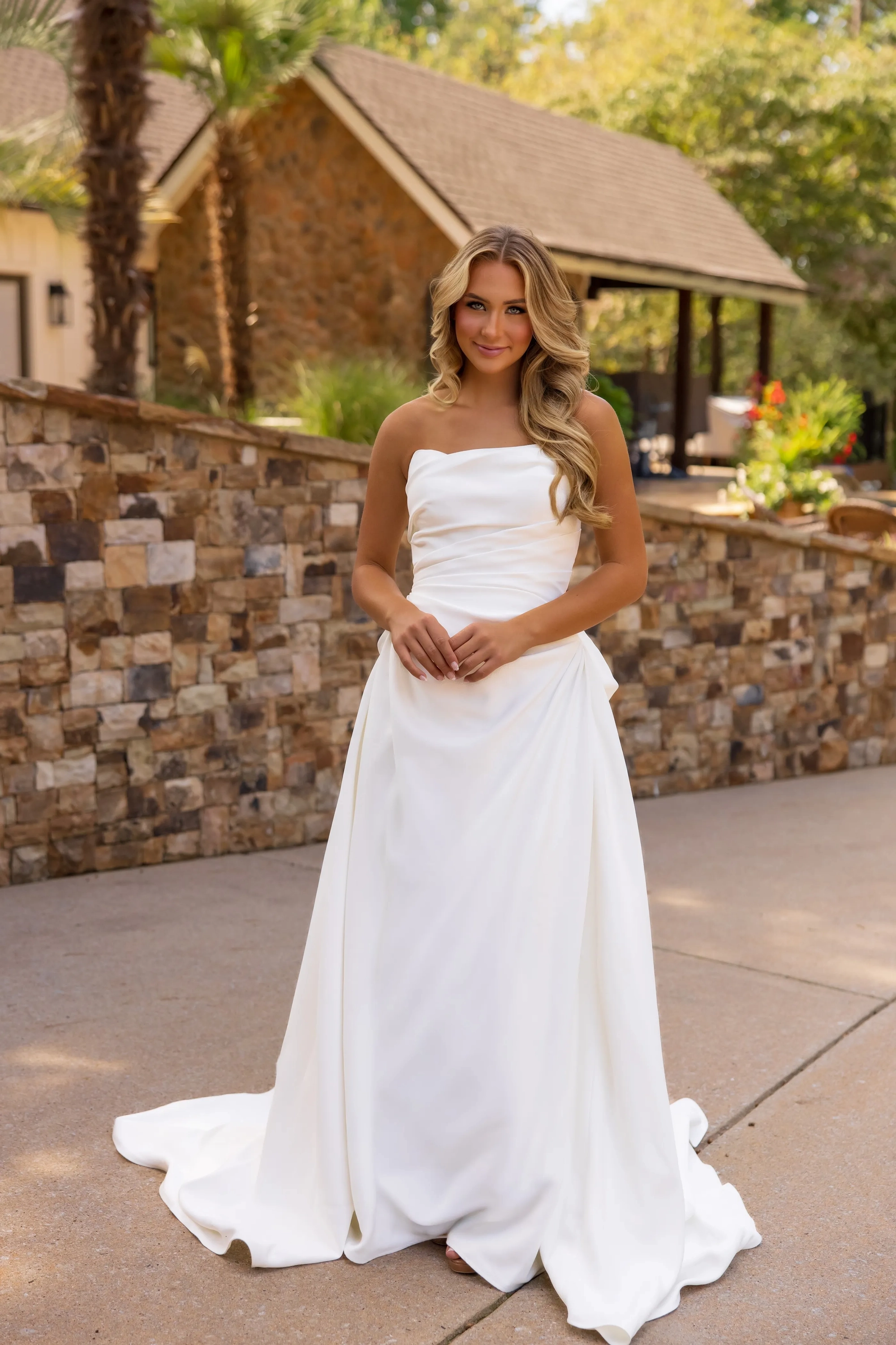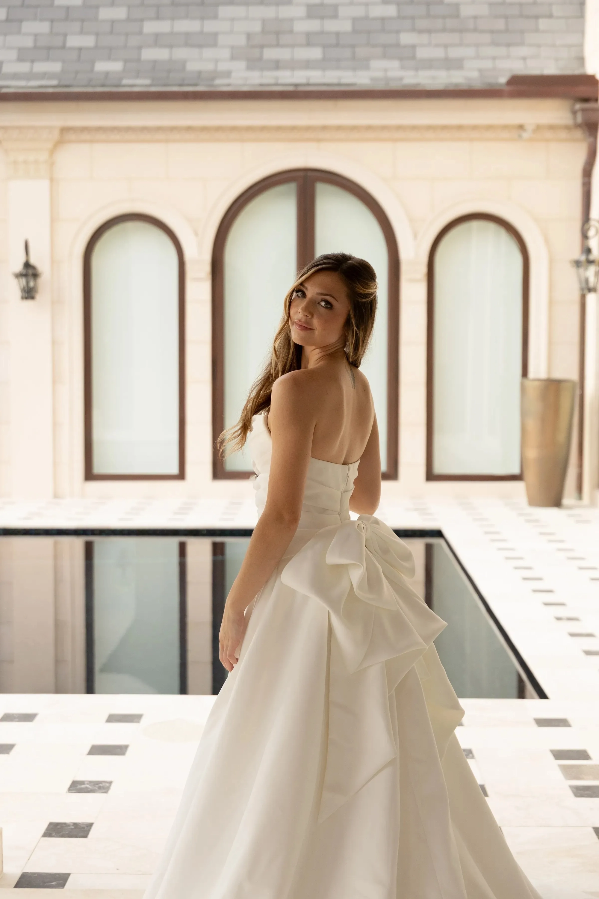 This diamond white wedding gown is the epitome of modern minimalism with a sculptural twist. The strapless neckline offers a clean, timeless frame while the bodice features asymmetrical ruching that gently wraps across the front. This artful draping enhances the figure, adding texture and movement to the sleek, structured silhouette. The skirt flows effortlessly into a graceful train, maintaining the gown's smooth, understated elegance. At the back, a detachable bow adds a touch of playful sophistication - bold yet refined - offering the bride the option of a dramatic accent for the ceremony and a more streamlined look for the reception.