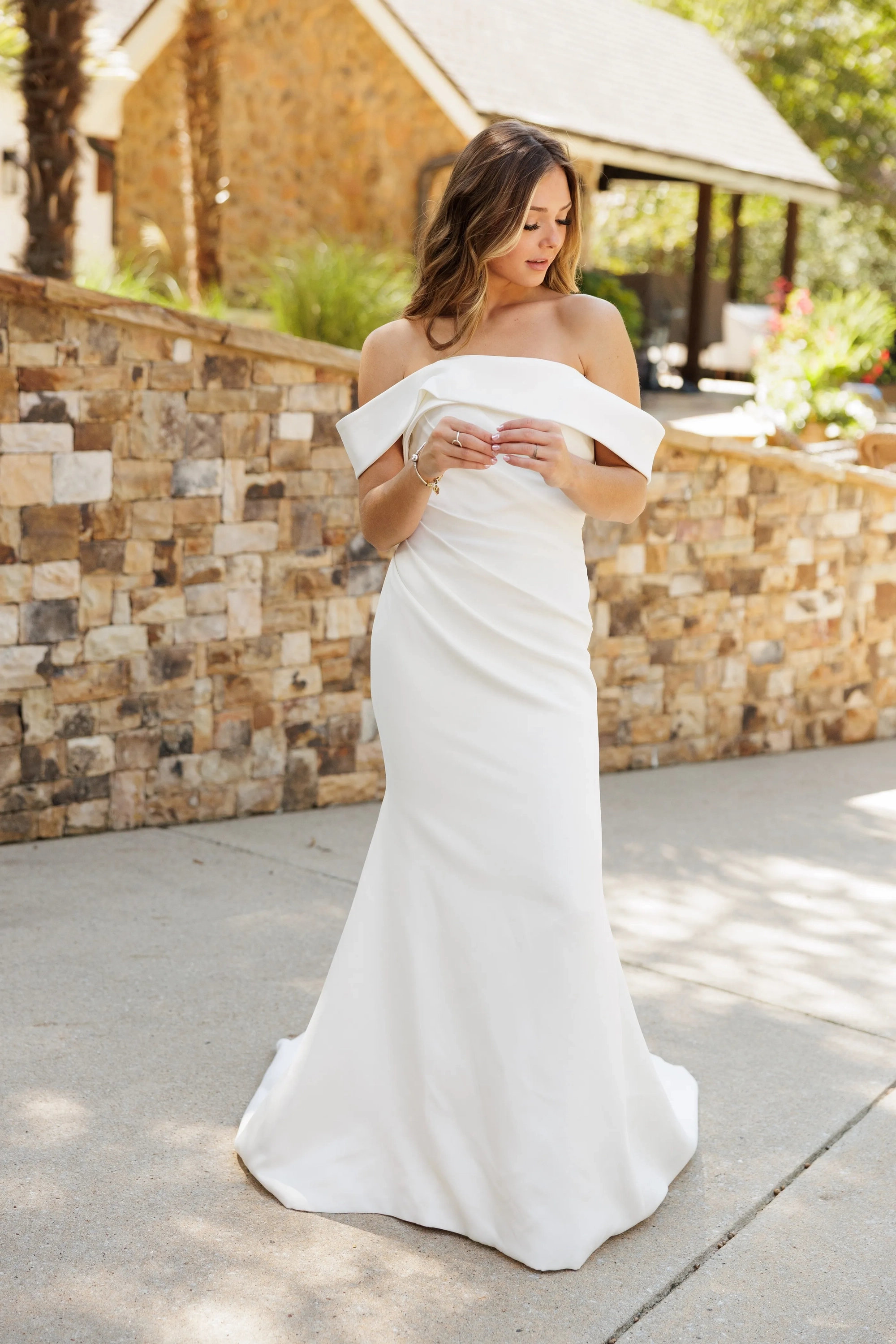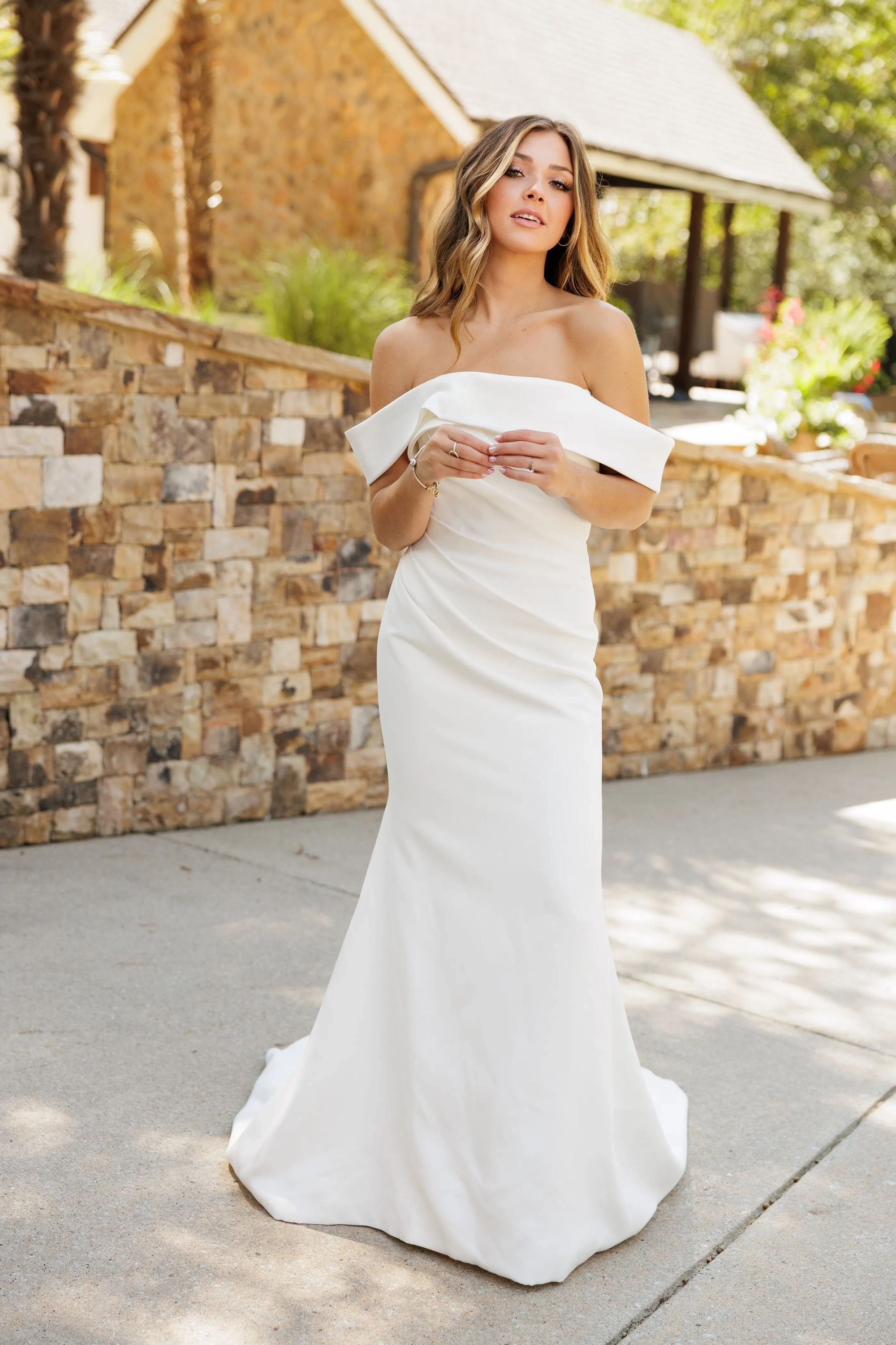This modern, beautifully fitted bridal gown strikes the perfect balance between simplicity and sophistication. The gown features elegant off-the-shoulder straps that gently drape over the arms in a soft, romantic way. The bodice is artfully ruched across the front, creating a flattering, sculpted look that enhances the natural curves of the bride. This subtle detail adds dimension and texture while maintaining a minimalist aesthetic. At the back, a row of covered buttons trails from the top of the zipper all the way down the train.
