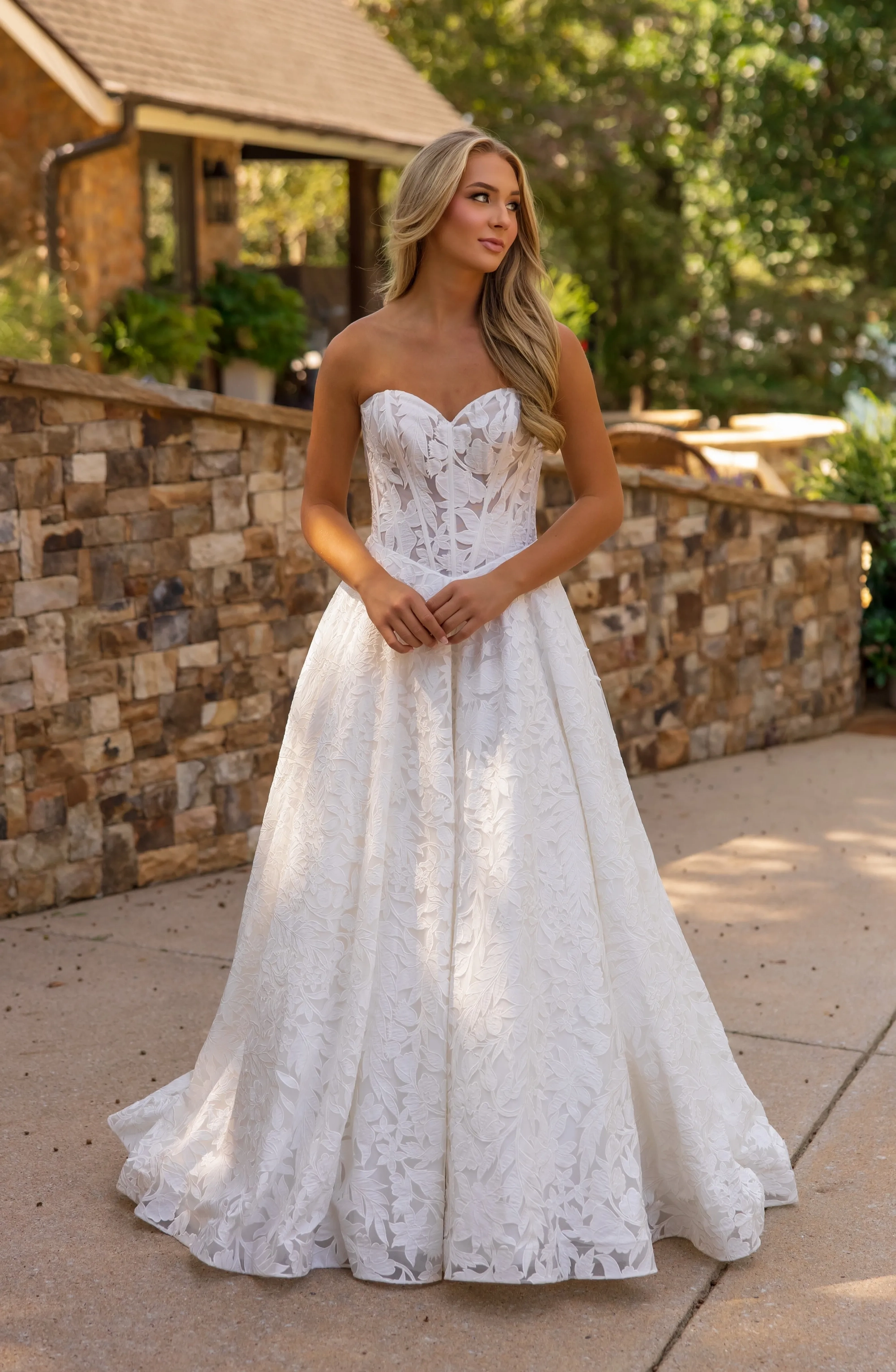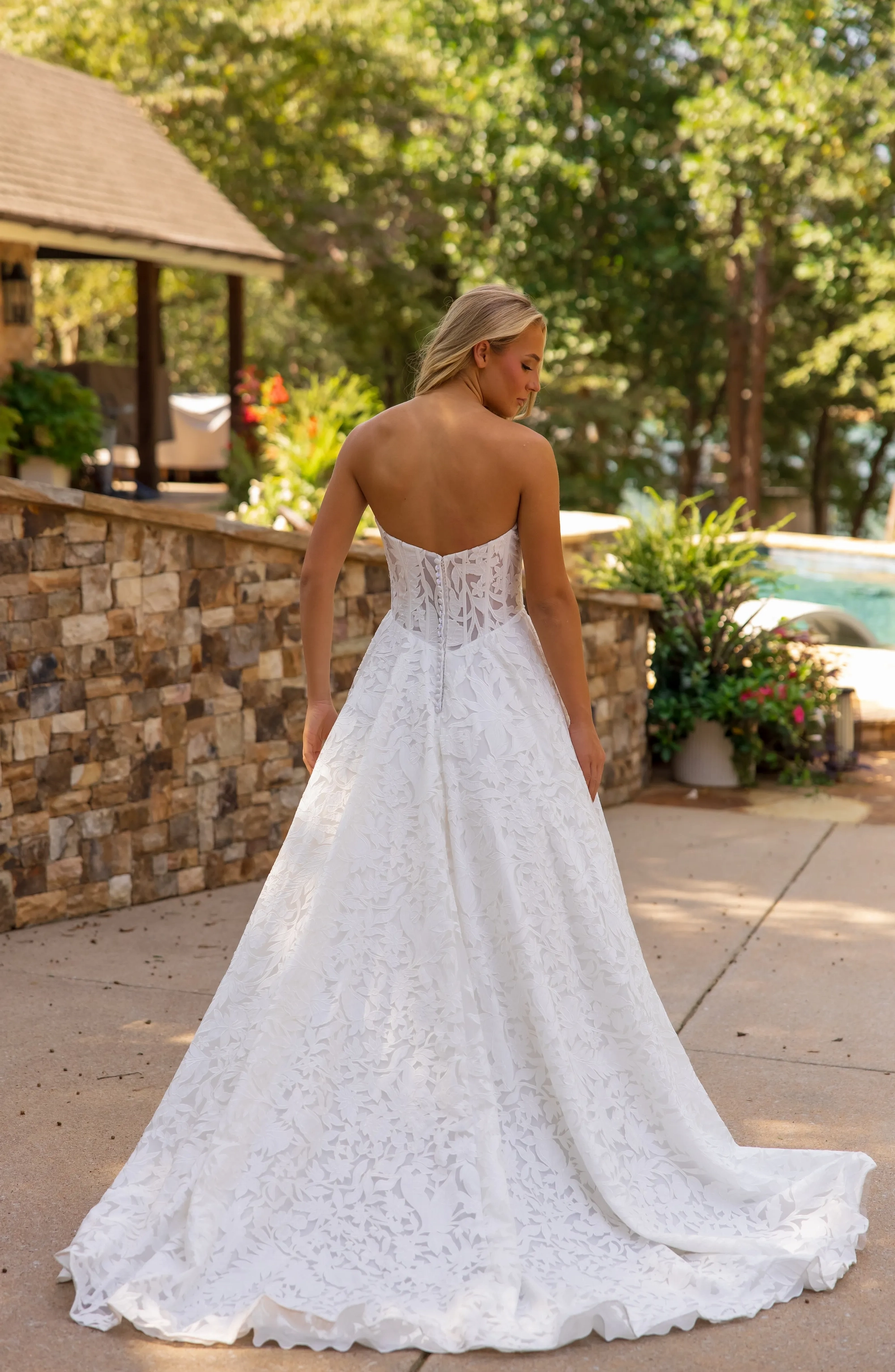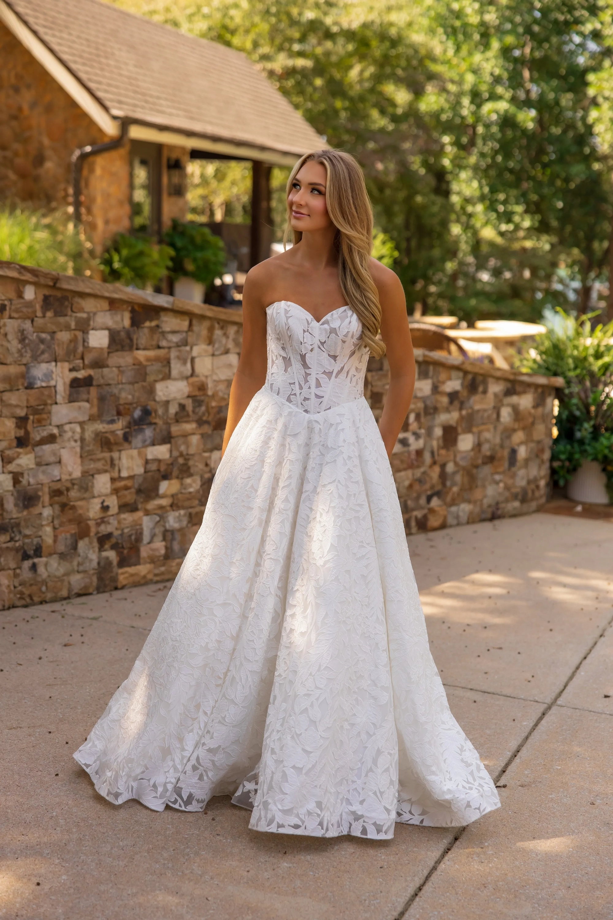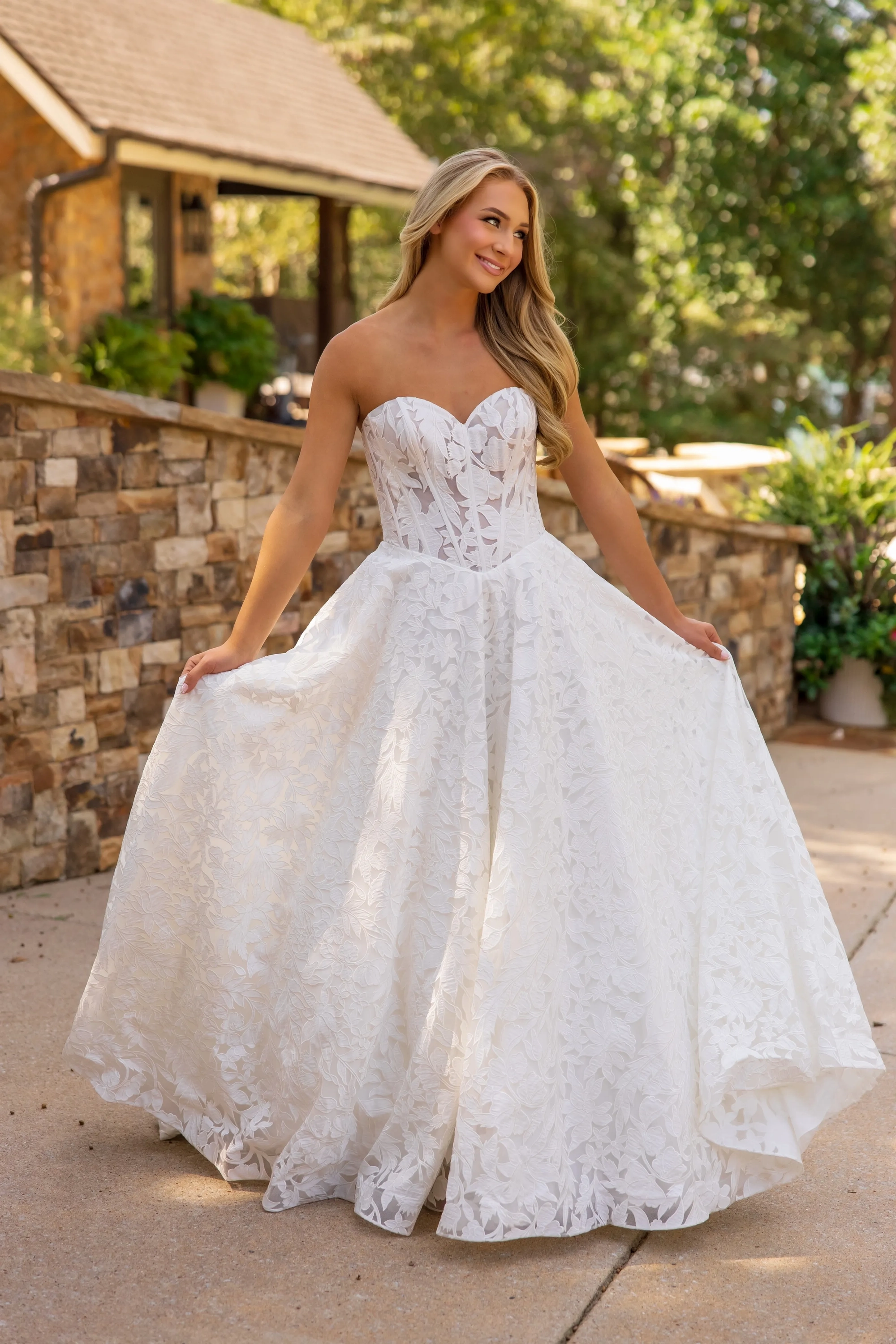 This gown features a strapless sweetheart neckline paired with a structured corset-style bodice creates a flattering, feminine shape. The sheer corset detailing adds a contemporary edge while still feeling bridal. This gown is the perfect balance of timeless ballgown romance and modern bridal fashion, for the bride who wants to feel both classic and fashion-forward on her big day.
