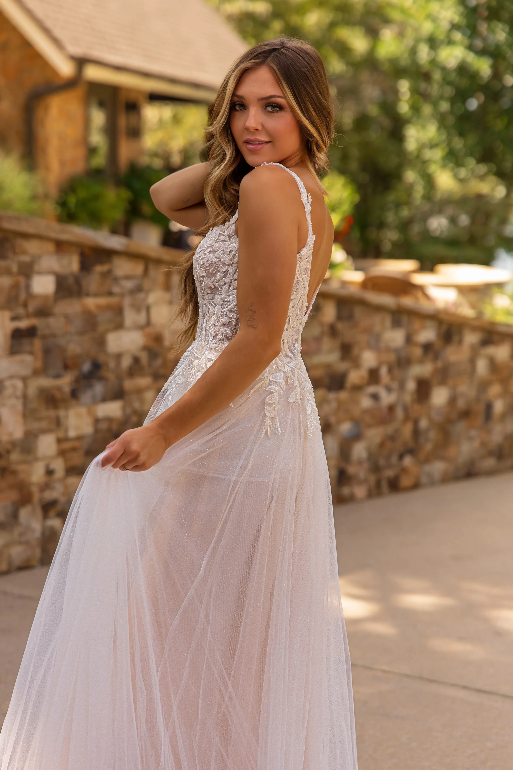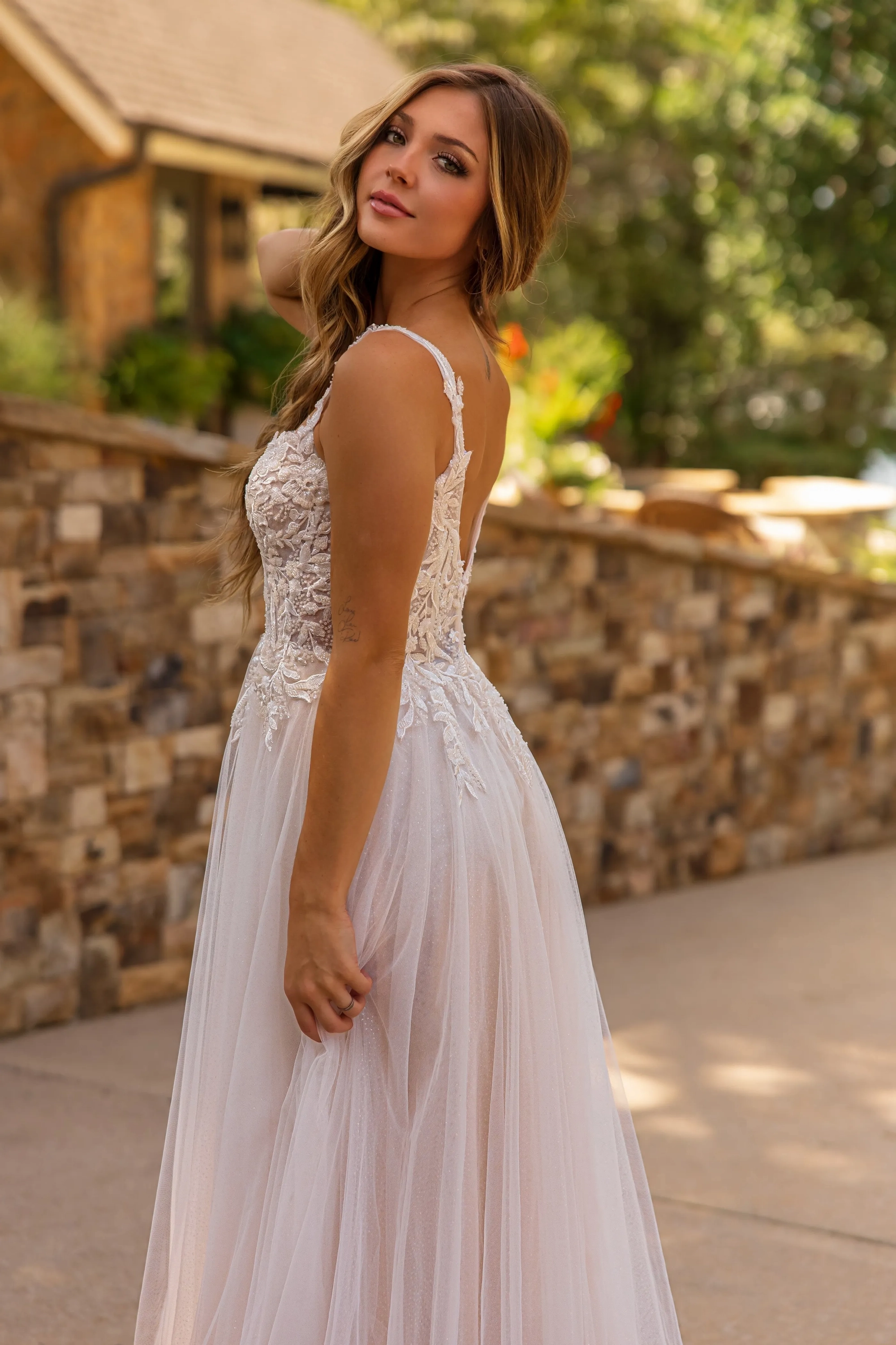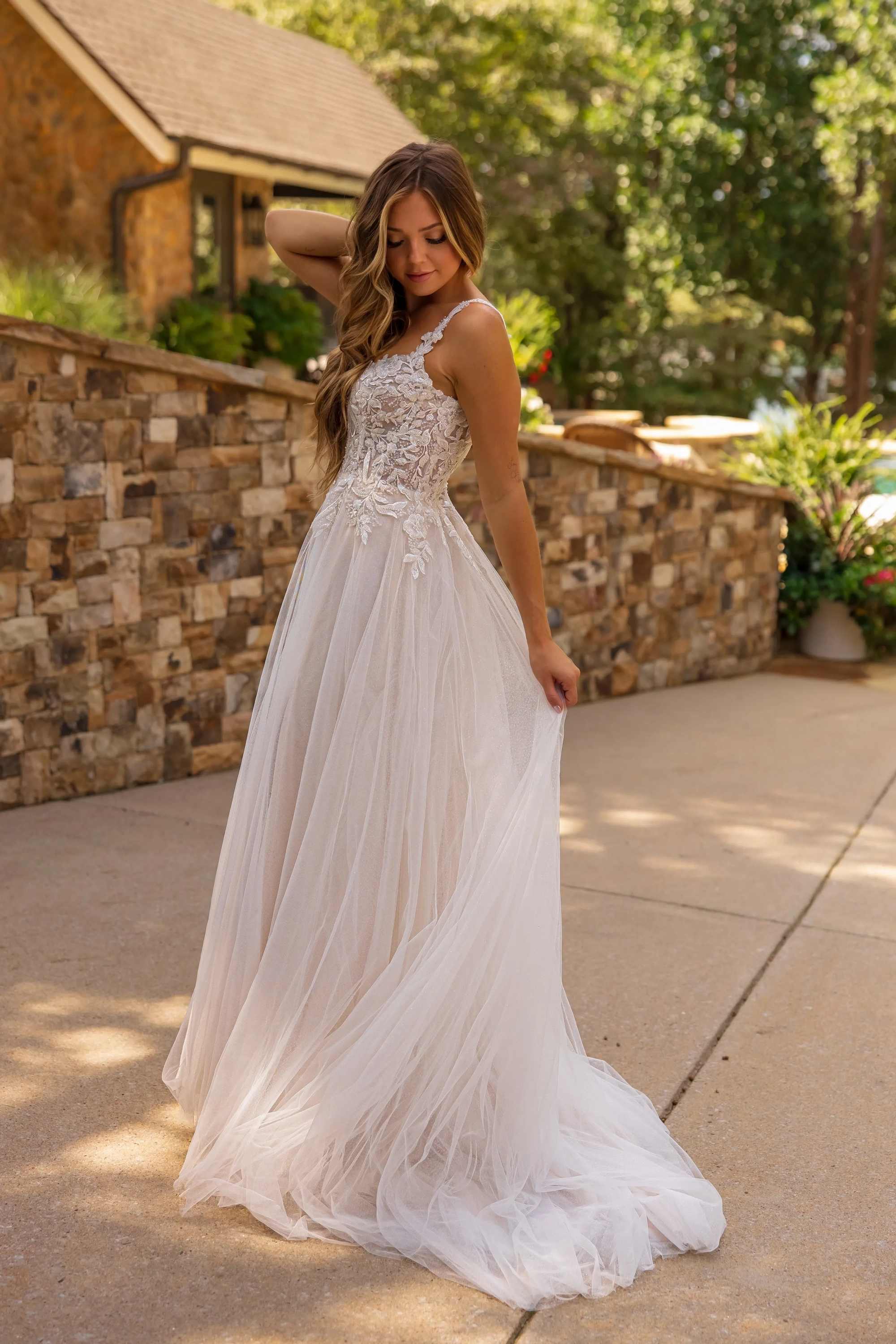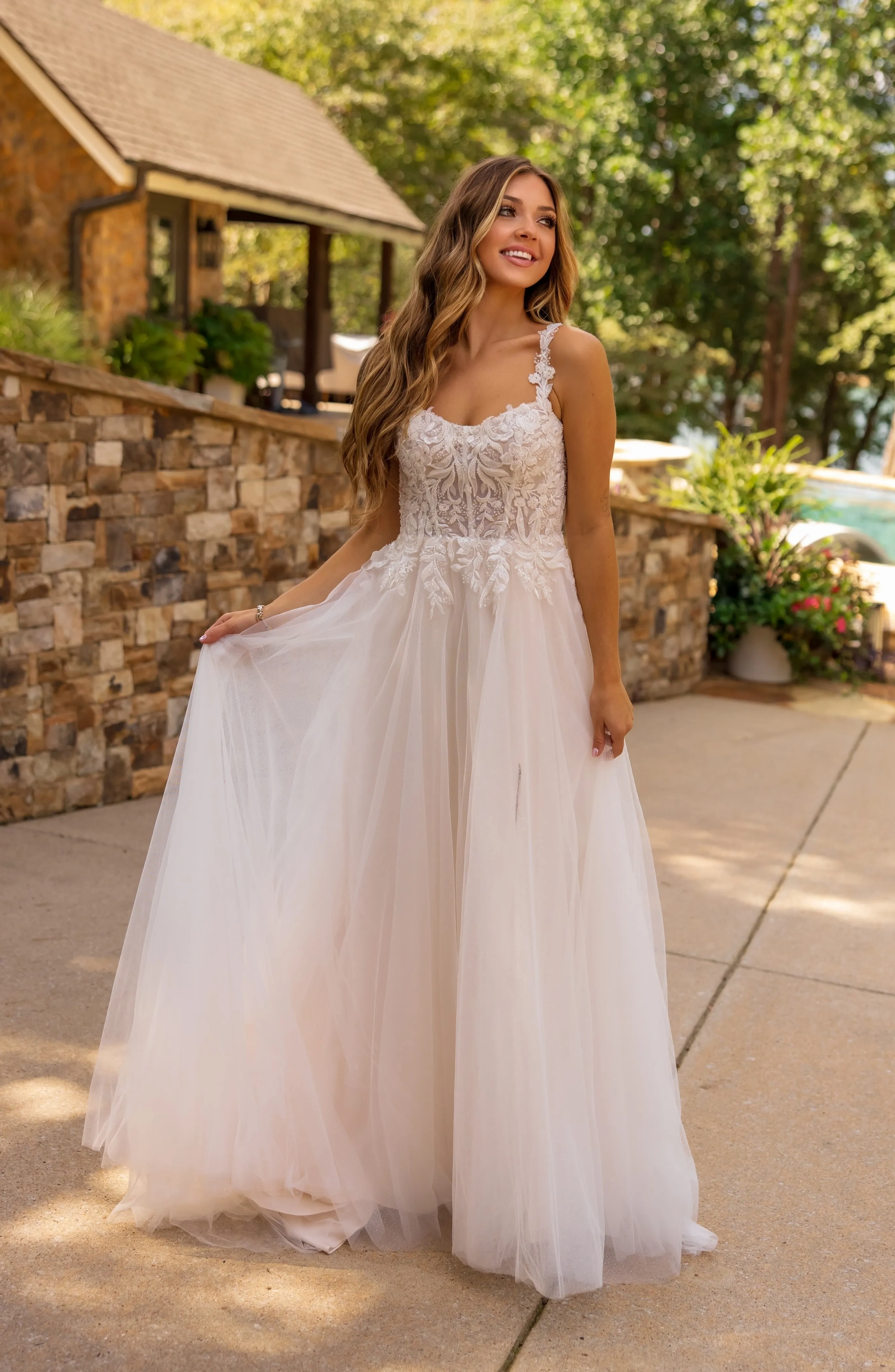 This bridal gown features a delicate scoop neckline with dainty floral applique straps. The bodice is semi-sheer and intricately adorned with embroidered lace appliques in a leafy, botanical pattern that adds texture and romance. With an A-line shape, the gown cinches at the waist before cascading into a voluminous tulle skirt. Romantic, airy, and whimsical - this gown is perfect for the bride who wants to feel like she's floating down the aisle in a modern princess moment.